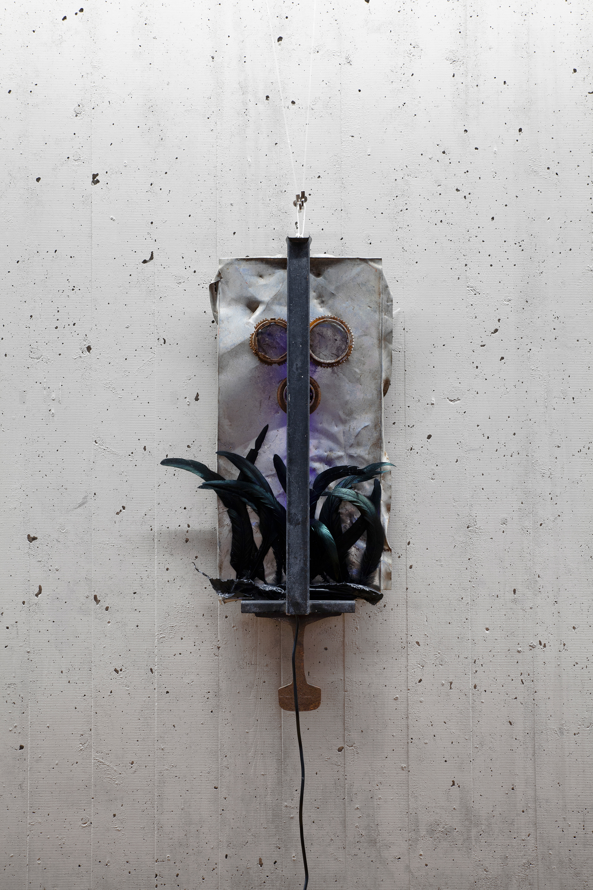 Material: Metall, Federn, UV-Leuchtstoffröhre, Schalter, Stecker auf Stahlblech – Maße: 30 cm (B), 80 cm (H), 10 cm (T)