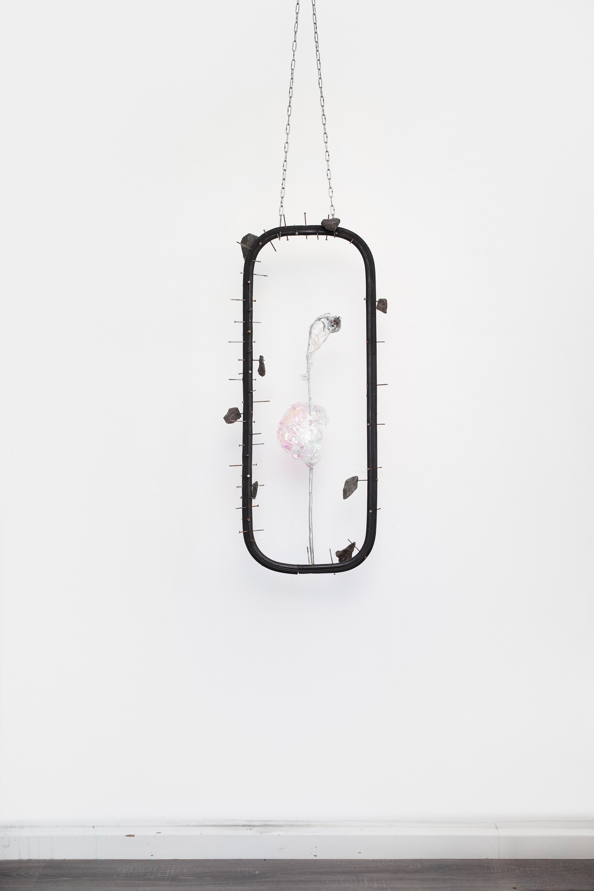 Material: Nägel, Granit, Trockenblume, Kunststofffolie auf Gummi an Stahlkette – Maße: 50 cm (B), 105 cm (H), 18 cm (T)